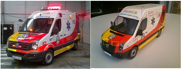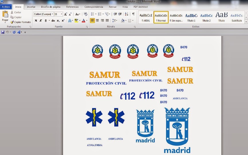 Por otro lado, si lo que necesitamos son rótulos o letreros la cosa es algo más complicada. Por ejemplo, en la maqueta del SAMUR, las palabras ambulancia, los rótulos de SAMUR, el número del vehículo... no los encontramos en Google, por tanto, hay que editarlos a "mano". Yo para esto uso el Word, aunque imagino que habrán otros programas que incluso puedan dar mejor resultado.