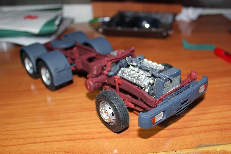 Continuando con el montaje, ya es hora de que vaya apareciendo la forma de camión, he pintado y dado algunos detalles al resto de elementos que van pegados al chasis. (en la imagen aún falta por pintar la tapa del depósito de plateado y las abrazaderas en negro, igual que con las abrazaderas de las botellas. También falta por dar alguna capa más de pintura al frontal)